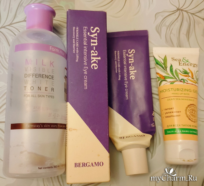 Крем для кожи вокруг глаз с пептидами змеи, Корея - огромный тюбик, конечно я его и для лица тоже использовала. Хорошо увлажняет, питает кожу. В целом норм, тем более что он мне достался за выигранные в конкурсе бонусы.