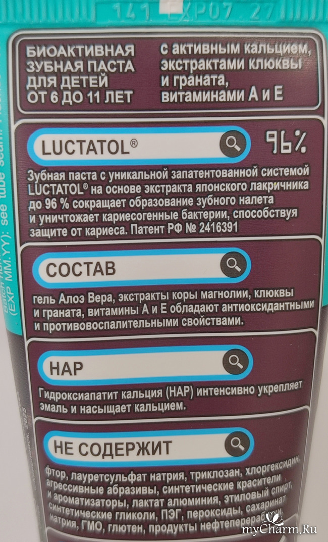 Зубная паста имеет запатентованную систему LUCTATOL® на основе экстракта японского лакричника. Что помогает сократить образование зубного налета, а также кариесогенных бактерий.