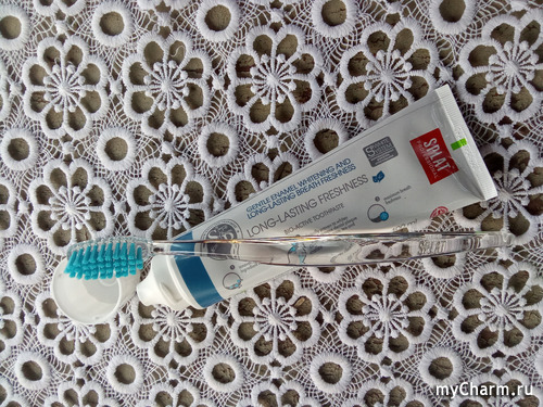 Обе пасты, как я уже сказала, отлично справляются с отбеливанием эмали. Отличным помощником им служит зубная щётка Whitening Medium. Она замечательно очищает поверхность зубов и промежутки – щетинки средней жёсткости действуют как волшебная метёлочка.
