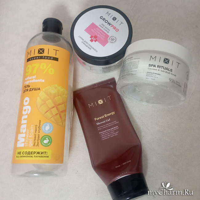 Средство от бренда Миксит, гель для душа Манго с приятным ароматом манго и клубники, нормальный можно ещё прикупить.