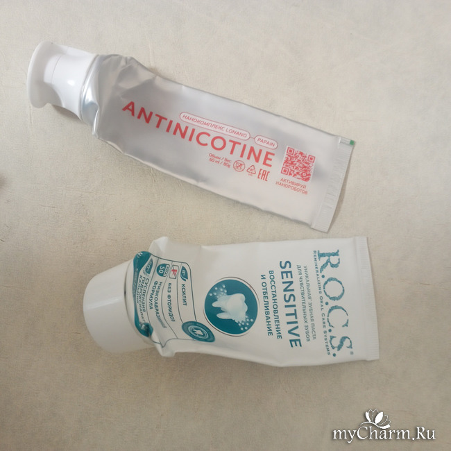 Зубная паста Antinicotine для взрослых антипаста с макробенефитами и паста R.O.C.S. для чувствительных зубов нам понравилось.