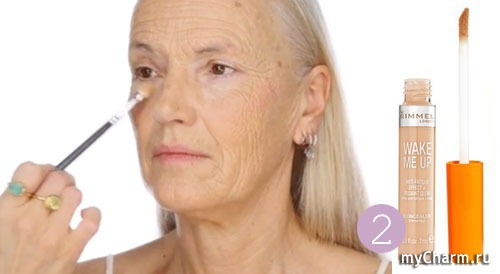 <b>Шаг 2. </b>Консилер. Лиза наносит его кисточкой, хотя у консилера Rimmel Wake Me Up Concealer (оттенок Ivory 10) есть удобный аппликатор. Точечными движениями нанести консилер под глаза, а затем растушевать пальцами.