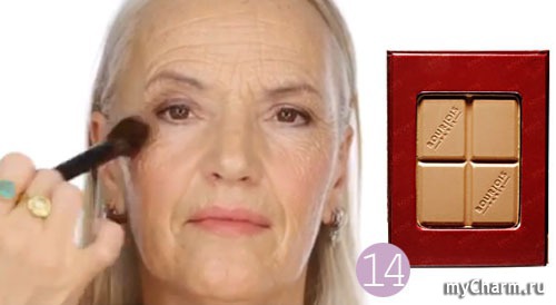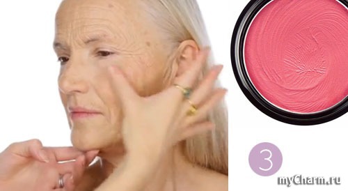 <b>Шаг 3. </b>Лиза оживляет кожу с помощью румян. Для возрастной кожи лучше всего использовать кремовые румяна, чтобы не было никакой сухости, а коже добавлялось немного свечения. Нанести пальцами немного румян на яблоки щек, а затем растушевать руками.