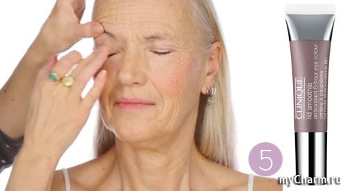 <b>Шаг 5. </b>Начинаем макияж глаз. На все веко нанести кремовые тени с неярким свечением, Лиза использует мягкие тени Clinique Lid Smoothie (оттенок Currant Affair 11), растушевывает пальцами.