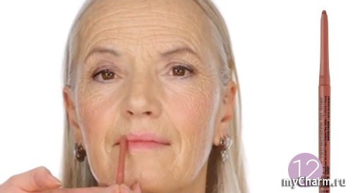 <b>Шаг 12. </b>Лиза приступает к макияжу губ. Сначала – обводит контур губ карандашом оттенка Nude. Она советует выбирать карандаш кремовой текстуры. Не делайте резкий контур, немного растушевывайте границу.