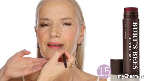 <b>Шаг 13. </b>Затем губы покрываются тонирующим бальзамом для губ, натурального оттенка. Это продукт хорошо подходит возрастной коже, поскольку гидратирует кожу и не слишком сверкает.