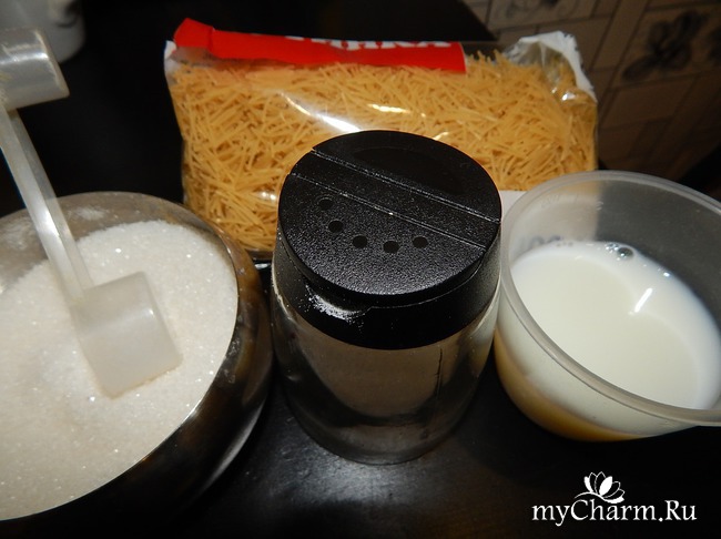 вермишель-паутинка, стакан молока, вода, щепотка соли, чайная ложечка сахара и ваши 10 минут.