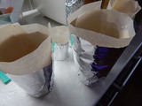 Взяли стеклянные банки 0,5 или 0,7, обернули пергаментом один-два слоя как получится, сверху фольгой слоёв 4. Запас от дна на 5-6см. Аккуратно сняли и закрепили степлером (можно просто сдвинуть вверх и в низ). Одели на банку, дно банки аккуратно завернули пергаментом (можно с надрезами) приложили к дну крышку для консервации без резинки дальше закрываете дно фольгой прижимая, хорошо дном постучите, что бы было устойчива. Снимайте форма готова.