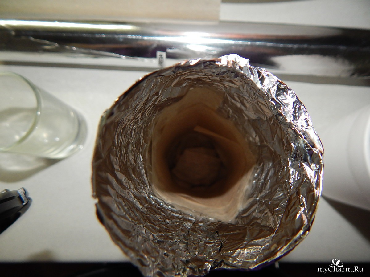 Обернула тару фольгой, далее слой бумаги и снова слой фольги. Ниже дна стакана оставляла столько фольги, чтобы можно было загнуть и закрепить, сделать дно. Хорошенько промять, сделать устойчивую форму.