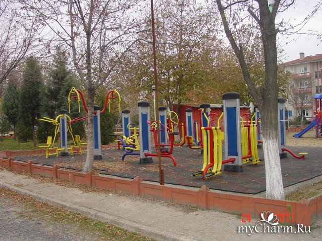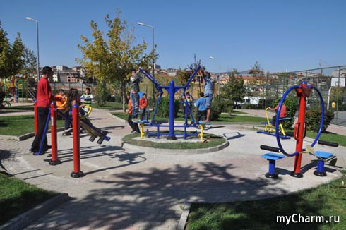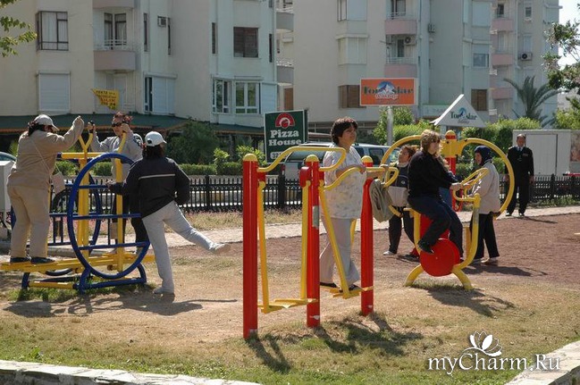 Все мы без исключения ходим отдыхать в парк. Кругом всё зелено, дышим свежим воздухом, слушаем песенки птичек, отдыхаем душой и телом одним словом. В Турции парки занимают в большинстве случаев большую территорию и чуть ли не через каждые 30-50 метров можно увидеть игровые площадки для детей в зависимости от их возраста. К игровым площадкам обычно бывает дополнение в виде спортивных площадок с обилием тренажёров. Иногда тренажёры располагают по кругу игровой площадки. Тренажёры самые обычные. Их можно увидеть на фото