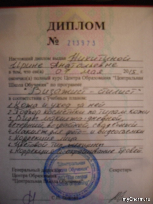 Я окончила школу профессионального макияжа Make-up ATELIER, имею диплом -Визажист салона красоты.