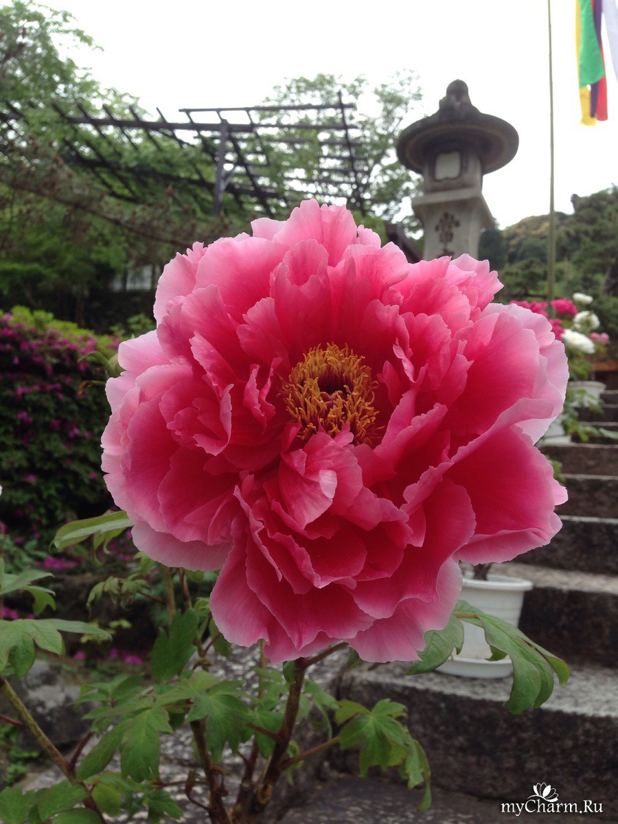 В зависимости от времен года, там цветут разные цветы. Летом хризантемы, осенью клен ( это правда дерево ), весной, в апреле сакура, а в мае огромные пионы! Красота - глаз не отвести