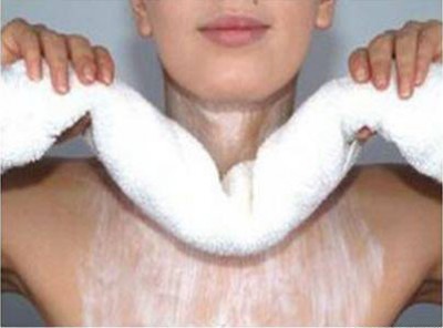Очень полезен для шеи массаж с помощью мокрого полотенца. Для этого намочите полотенце холодной водой, отожмите его. Возьмитесь двумя руками за концы полотенца, поднесите его снизу к подбородку и резко расправьте. Полотенце должно нежно хлопнуть вас по подбородку, как раз в том месте, где чаще всего образуются складки. Повторяйте это упражнение каждое утро раз 10-12, и контур вашего лица всегда будет подтянутым и четким.