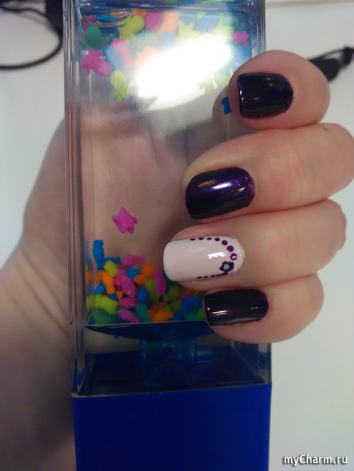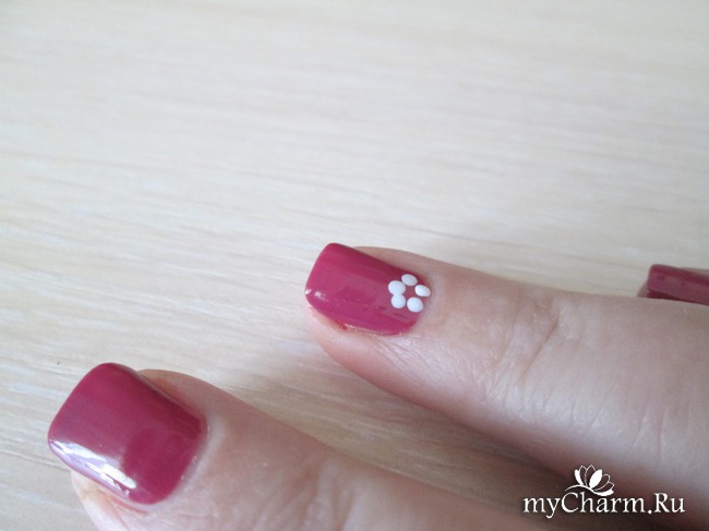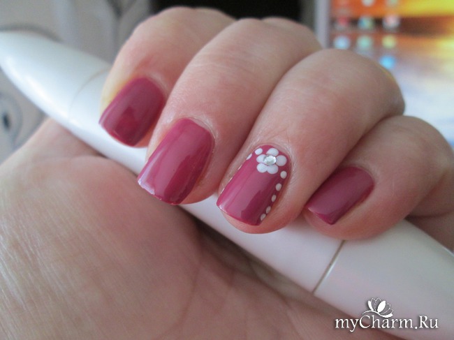 Всем привет! Вот и я решила показать свой простенький в исполнении маникюр. Я использовала: Покрыла ногти защитной базой, затем покрыла лаком ягодного оттенка (так мне сегодня захотелось): Капнула белым лаком на листочек бумаги и затем при помощи дотса нарисовала цветочек и приклеила стразинку в серединку: Затем покрыла защитным средством и маникюр готов Читать полностью |