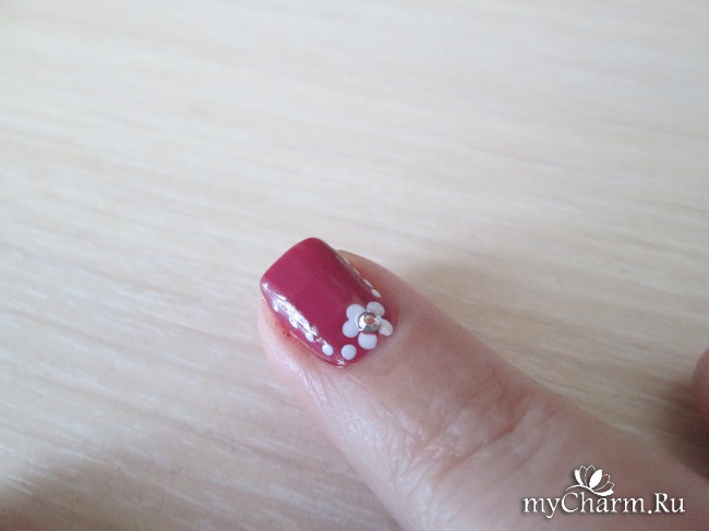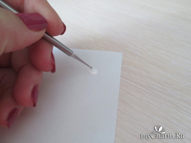 Капнула белым лаком на листочек бумаги и затем при помощи дотса нарисовала цветочек и приклеила стразинку в серединку: