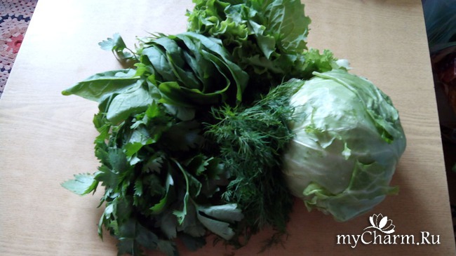 Добавили салат, шпинат, укроп и сельдерей, который дал замечательный привкус и запах.