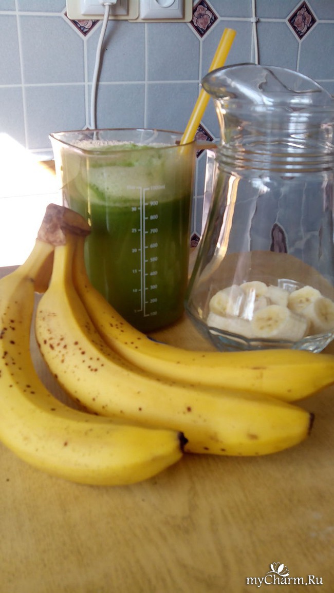 Потом взяли парочку бананов. Я их прямо в кувшинчике взбила блендером, добавила туда жмых от выжатой зелени и разбавила соком.
