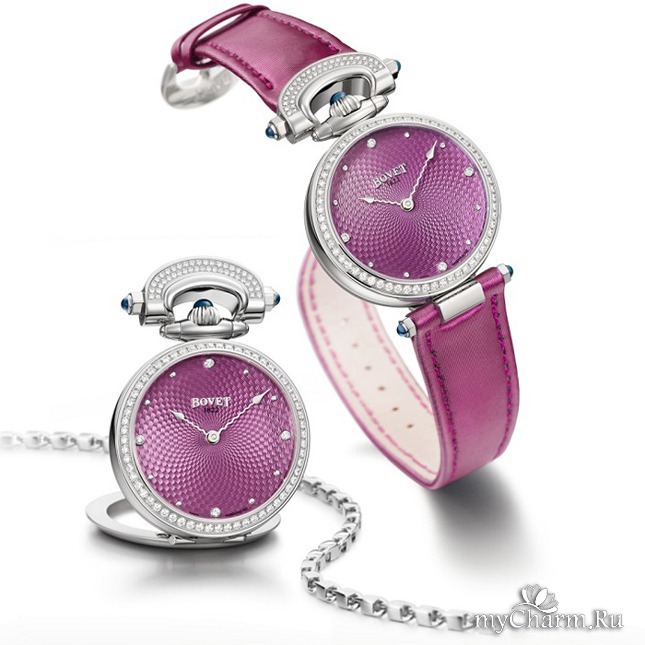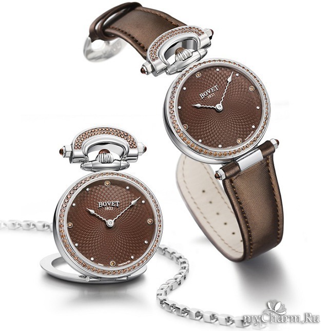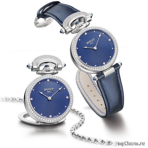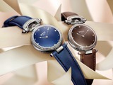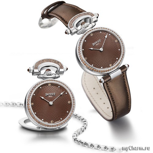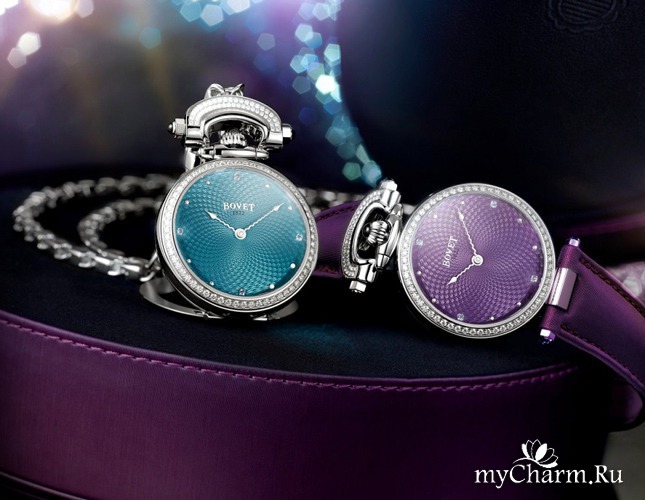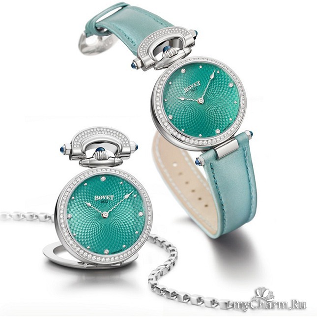 Пять лет назад была выпущена и женская версия Amadeo Fleurier Miss Audrey, существовавшая в бирюзовом и фиолетовом цветах. В этом году модель обновили, а ее палитру расширили в два раза. Теперь можно выбрать еще и между шоколадным и темно-синим вариантами. Корпус по-прежнему выполнен из стали, безель усыпан бриллиантами, а по гильошированному циферблату идут две тонкие волнистые стрелки. Единственное заметное изменение в дизайне — заводную головку и детали сложного крепежа-трансформера теперь украшают сапфировые кабошоны в тон. Обновленную версию ищите в бутиках Bovet и часовых салонах уже в июне.