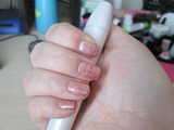 Наносим основу на ноготь и пока она не высохла спонжиком наносим блестки на ноготь, кончик ногтя делаем насыщенным, а затем все меньше и меньше наносим блесток, как бы растягивая их.