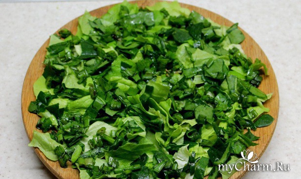 Шпинат или салат (латук), щавель, зеленый лук, укроп.