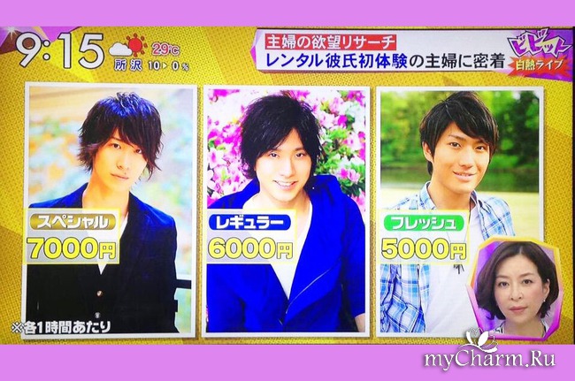 Оказывается, в Китае и Японии для слабого пола существует сервис Rent-a-Boyfriend (аренда бойфренда). Для чего девушкам эти услуги? В отличие от наших сервисов «муж на час», где женщинам предлагают услуги сантехников, плотников и грузчиков, клиентки служб Rent-a-Boyfriend берут напрокат парней, чтобы вместе куда-нибудь съездить на выходные, сходить на пляж, в кино, караоке или взять спутника с собой на шоппинг.
