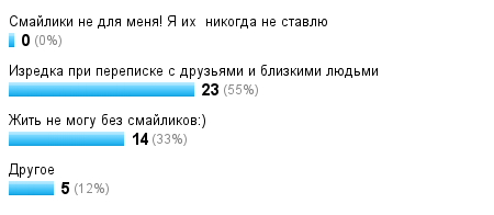 А сейчас я не могу написать без них ни одно сообщение. Возможно из-за того, что я очень эмоциональный человек, получить сообщение без смайла - это почти катастрофа; иногда даже расстраиваюсь, что любимый не поставил после смс скобочку или поцелуйчик
