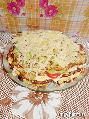 Из теста жарим блинчики, промазываем начинкой. Я еще между слоями положила тонко нарезанный кружочками помидор