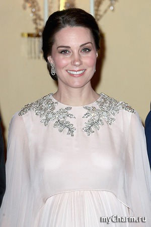По прибытии в Норвегию, принц Уильям и Кейт Миддлтон осмотрели дворцовые сады, встретились с поклонниками и, наконец, попали за торжественный ужин в их честь.На Кэтрин было элегантное светлое платье, украшенное вышивкой с серебром – совершенно воздушное и легкое.