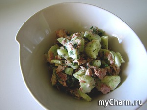 1. Отчистите огурец и нарежьте его. Нарежьте базилик. Слейте воду с тунца. Смешайте в салатнице все ингредиенты, посолите и добавьте перец.