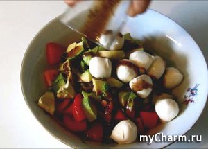 1. Для соуса смешайте между собой бальзамический уксус, масло, соль, перец и базилик. Порежьте помидоры и огурец. Ложкой отделите авокадо от шкурки и порежьте на кубики.
