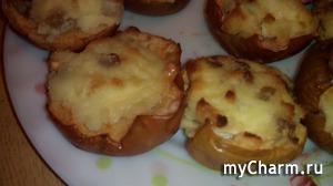 В творог добавила немного сахара, нежирной сметанки, чтобы он помягче был. Думаю, можно просто вместо сахара и сметаны в следующий раз добавить варенье. Еще положила изюм, перемешала и заполнила яблочки... Читать далее»